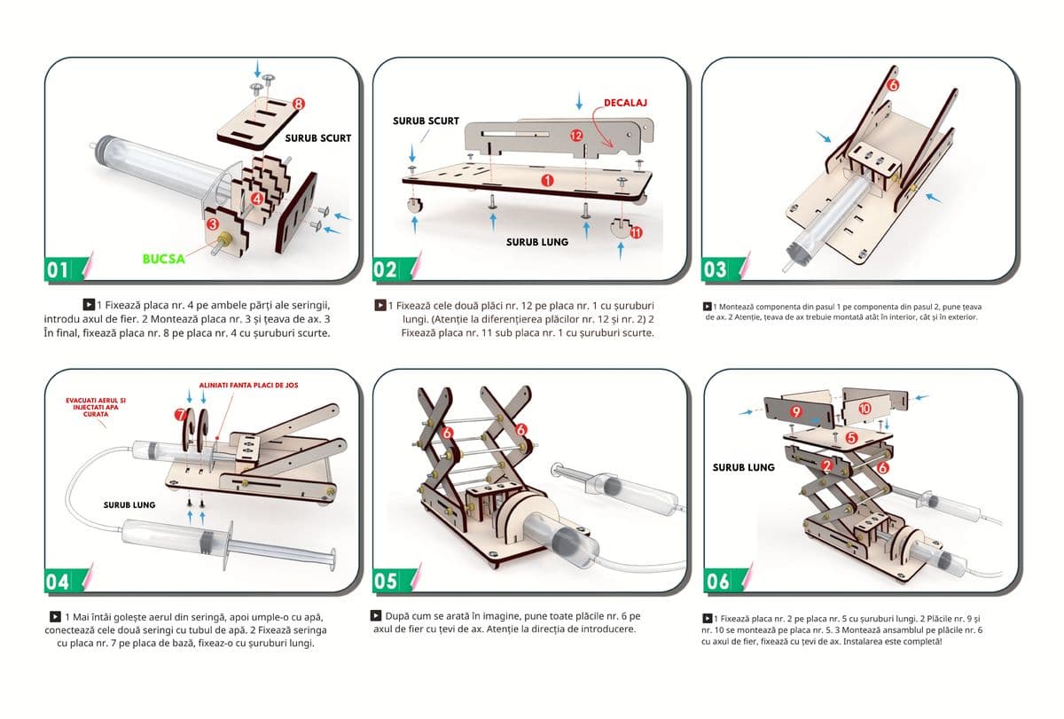 Descoperă principiile hidraulicii cu acest lift simplu și fascinant! Copilul va asambla un sistem de cilindri hidraulici, pompe și conducte care funcționează cu apă sau ulei. Apăsând o mică pompă, el va vedea cum o forță mică create o forță mare pentru a ridica o platformă grea. Kit-ul demonsrez principiul lui Pascal – forța aplicată unui fluid se transmite egal în toate direcțiile. Experimente practice vor ajuta copilul să înțeleagă cum funcționează uneltele și mașinile hidraulice din viața reală.