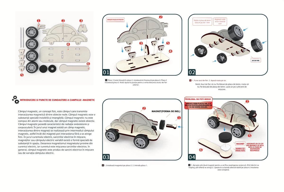Descoperă puterea magnetismului cu această mașinuță care se mișcă fără motor! Copilul va asambla o mașinuță din plastic cu magneti permanenți încorporați. Prin plasarea ei peste o bandă magnetică sau folosind magneți externi, mașinuță va accelera și se va mișca pe cale magnetică. Kit-ul demonstrează forțele magnetice, atracția și respingerea. Perfect pentru a înțelege elementele de bază ale magnetismului și cum interacționează magneții. Experiment grozav pentru a explora fizica magnetismului și aplicațiile sale.