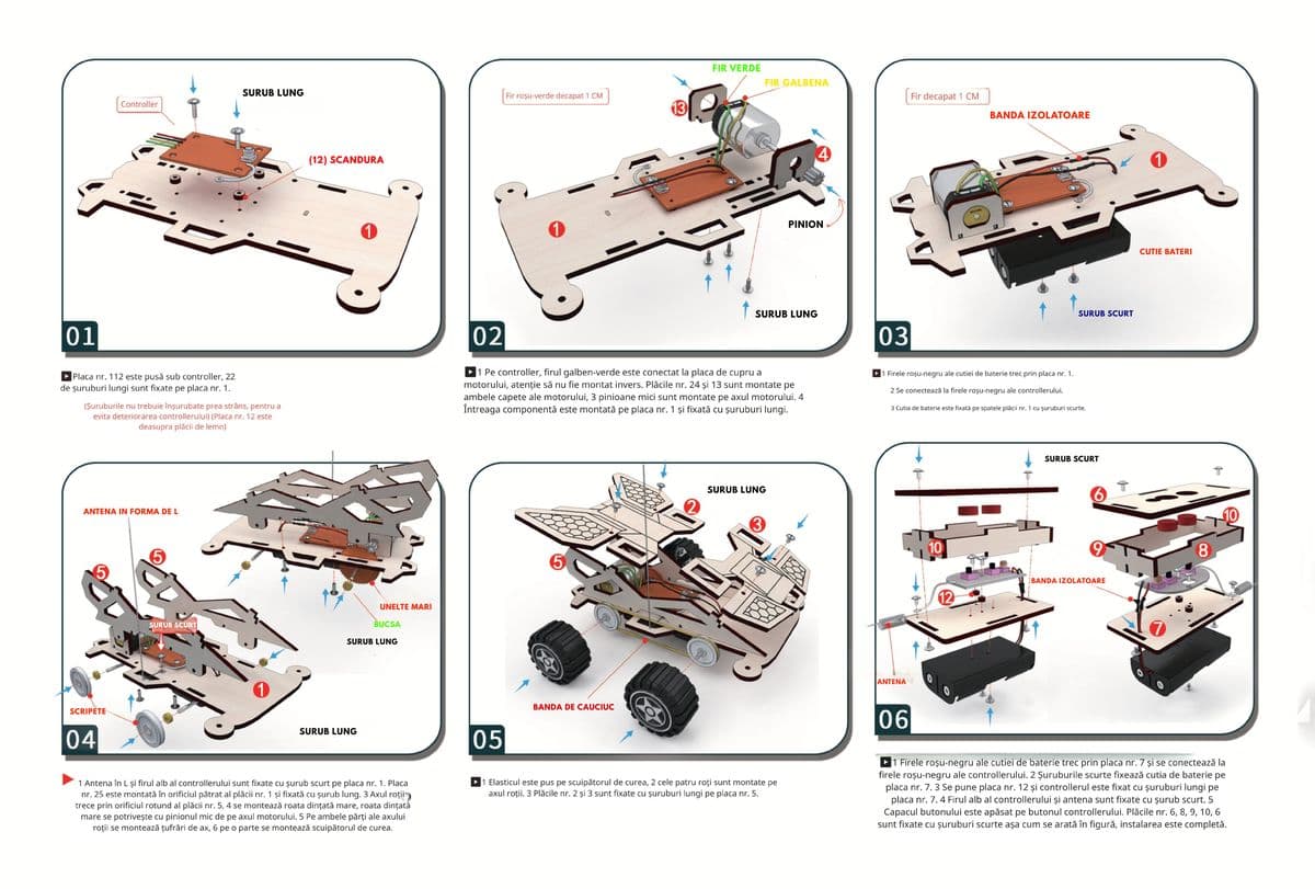 Această mașinuță de curse telecomandă este un proiect avansat care combină electronica, mecanica și ingineria! Copilul va asambla de la zero sistemul de acționare cu motoare separate pentru direcție și propulsie, va conecta circuitele și va configura telecomanda. Kit-ul include roti performante și suport pentru viteze mici și mari. Experiența educativă include înțelegerea circuitelor RC, cum funcționează motoarele de curent continuu, transmisia puterii, și controlul wireless. Perfect pentru adolescenți pasionați de tehnologie și inginerie.